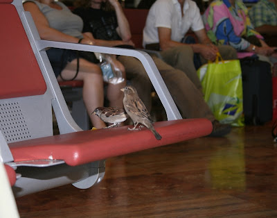 Jo tampoc hi he vist mai pardals… Serà una nova atracció per distreure als passatgers que esperen el seu vol…