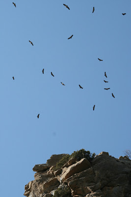 En total, segons un gps, hem fet uns 11 km i algo. Pujades i baixades; voltors; boscos i paisatges espectaculars i com per variar caçadors.