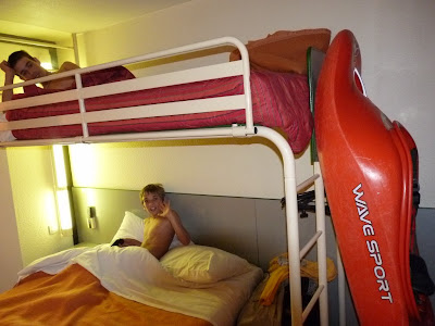 Ara estem en un hotelillo de carretera, d’aquests baratillos, però que tenen lavabo i dutxa a l’habitació, tele amb canal +, parking tancat i wifi gratuït. Una habitació per tres per 38 eurillos! Ah, i el kayak, com no, dorm amb nosaltres!