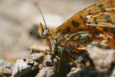 Tal com estava previst avui hem parat una mica més abaix. El riu ja és més ample i baixa més aigua i té més desnivell. Tampoc hi havia massa flors… Les de sempre i avui no han vingut les eqües no…. han aparegut les xones! I papallones també n’hi havia… Aquesta sembla que sigui una damer… A la tolla n’hi havia una mig moribunta pobreta…