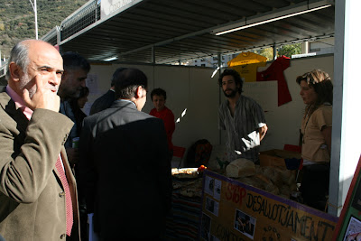Al matí els polítics (alcalde, president de la Diputació, regidors, i més gent trajada) han passejat per la fira. Aquest és el moment en que han saludat als okupes d’Escós. Aquest senyor de primera fila feva senyals a algú altre però no sé si tenia res a veure. No he sentit la conversa que han tingut.