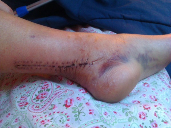 El peu sembla un botifarró. Morats i inflamacions diverses, trossos de pell en diferents estats… de fet la cicatriu ara mateix és lo de menys.