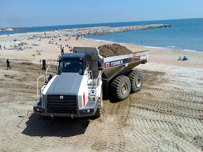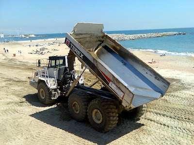 Estan arreglant les platges per l’estiu. Bé, allí suposo que la temporada de platja com aquell que diu ja ha començat. Hi havia uns camions enormes, i molt guapos, repartint sorra. Molestaven bastant pel soroll i la pols que feven.