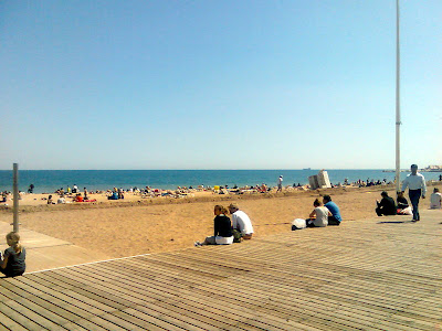 Ahir el migdia, amb la meua mare, vam passejar per la platja de la Barceloneta. Feia molt bon dia, calor però amb una mica d’airet. El mar estava ben pla, i a la sorra hi havia gent prenent el sol. Hi havia molta gent passejant, entre ells molts turistes.