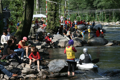 Avui ha començat novament. Hem començat amb la Copa Promoció de la Federació Espanyola. Tot i ploure d’una manera espectacular hi ha hagut una gentada de por. Penso que mai havia vist el camp d’slàlom tant ple com avui. Hi havia barques per tot arreu, gent a baix, gent a la barana, gent a l’altre costat. Algo impressionant. Hi ha hagut 100 participants, que aviat estar dit!